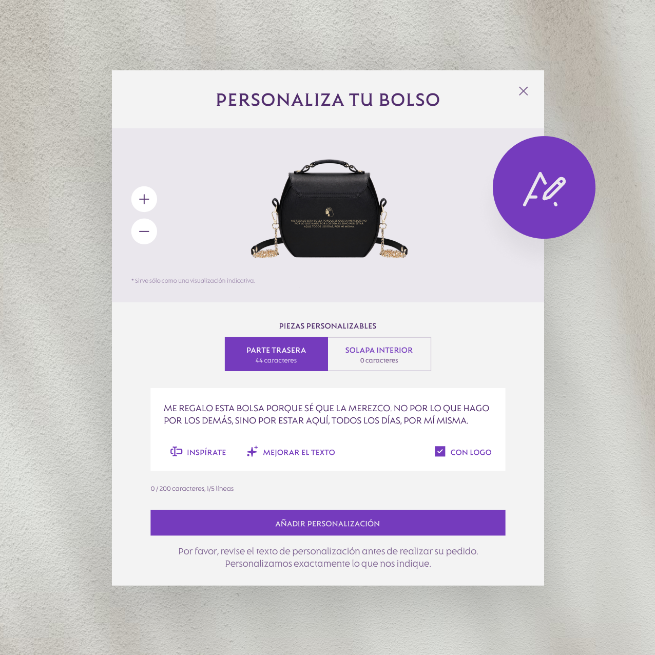 Elige dónde quieres colocar tu mensaje: en la solapa interior o en la parte trasera del producto. Introduce tu propio texto (en cualquier idioma) o elige entre nuestras inspiraciones. ¿No sabes qué escribir? Deja que te lo generemos. El color del texto del bolso se adapta al color de los acabados metálicos, pero en algunos modelos el color es negro.